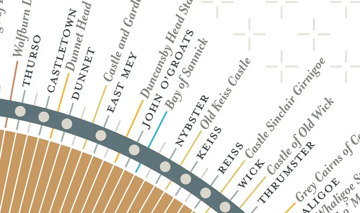 The main route is shown on our poster as a dark grey circle and within that, any locations directly on the route are indicated by a circle within it. Places of interest are pinned and set in italic type.