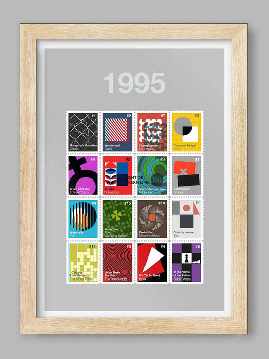 Our 1995 music poster print celebrates one the great years in popular music in the UK. The poster features 16 iconic singles from 1995 with each song created in a modernist style. What's your favourite?