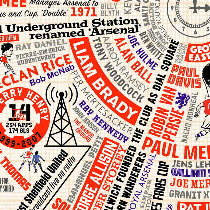 Our Arsenal Wheel of Fame Poster Print celebrates the events and names of this historic football club. From Dial Square to Arsenal, from Plumstead to Holloway!