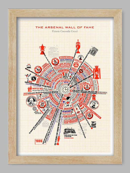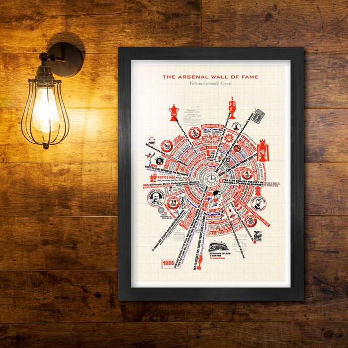 Arsenal Wheel of Fame Poster Print is printed on a smooth 230g stock and available unframed or framed in a wooden frame with clarity+ acrylic.