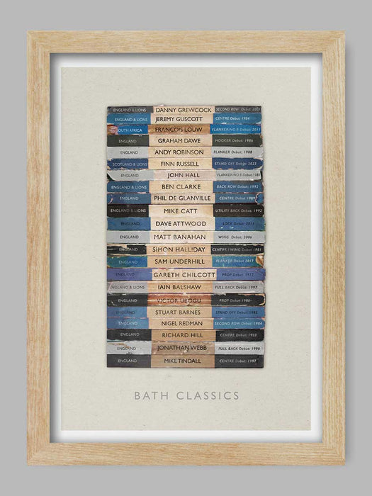 Bath Classics - Rugby poster print celebrates some of the great names in the club's history. It features their debut years and their international representation. Styled on the classic mid-century penguin book designs.