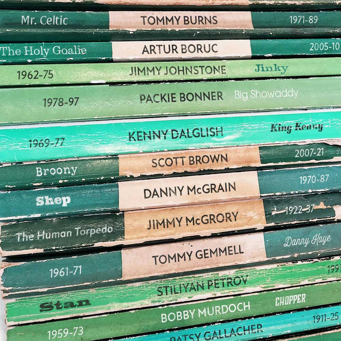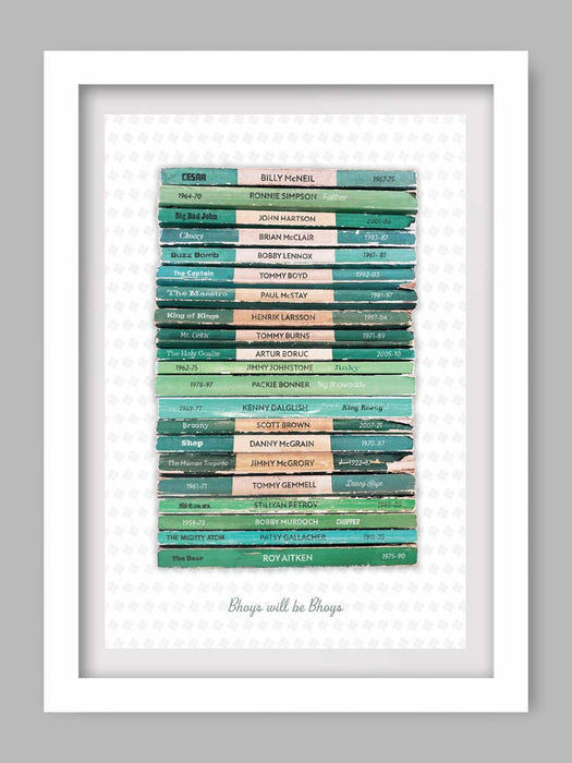 Bhoys will be Bhoys - Celtic poster print celebrates some of the great names in the club's history. It features the years they played for the club and their nicknames. Styled on the classic mid-century penguin book designs.