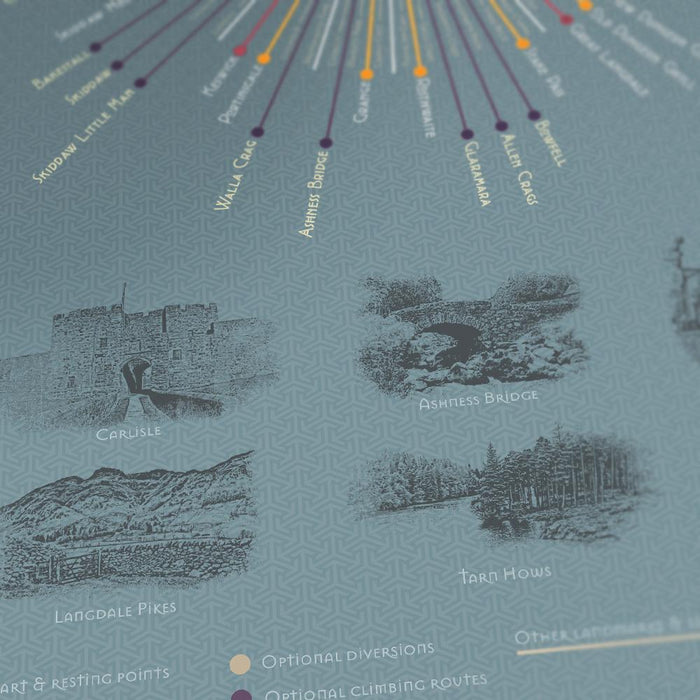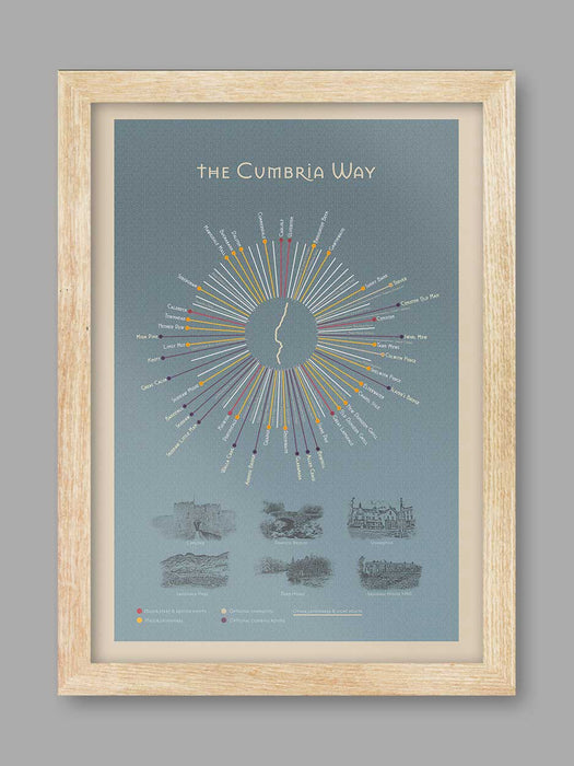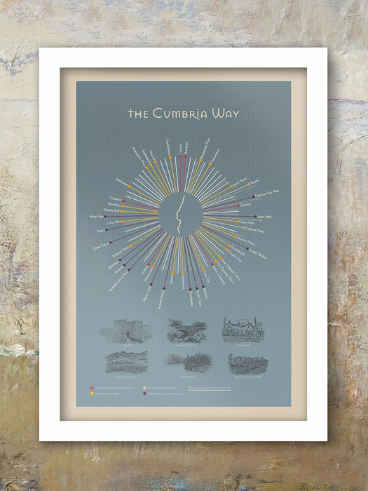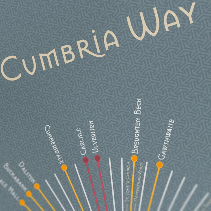 Our Cumbria Way Poster Print celebrates the famous Cumbria Way which runs from Carlisle to Ulverston and can be walked either from North to South or South to North. our infographic Cumbria Way poster print records the major points on the journey including alternative routes, landmarks and sights.