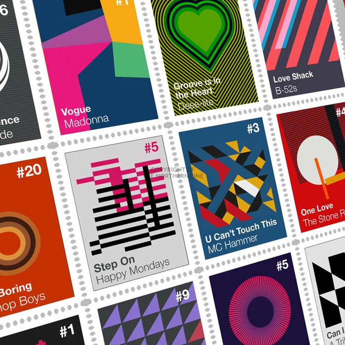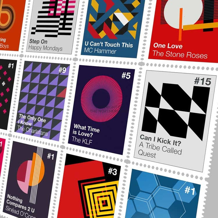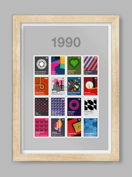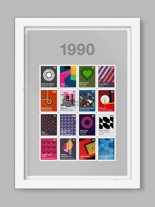 Our 1990 music poster print celebrates one the great years in popular music in the UK. The poster features 16 iconic singles from 1990, with each song created in a modernist style. What's your favourite?
