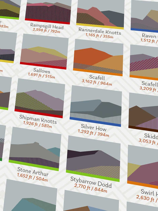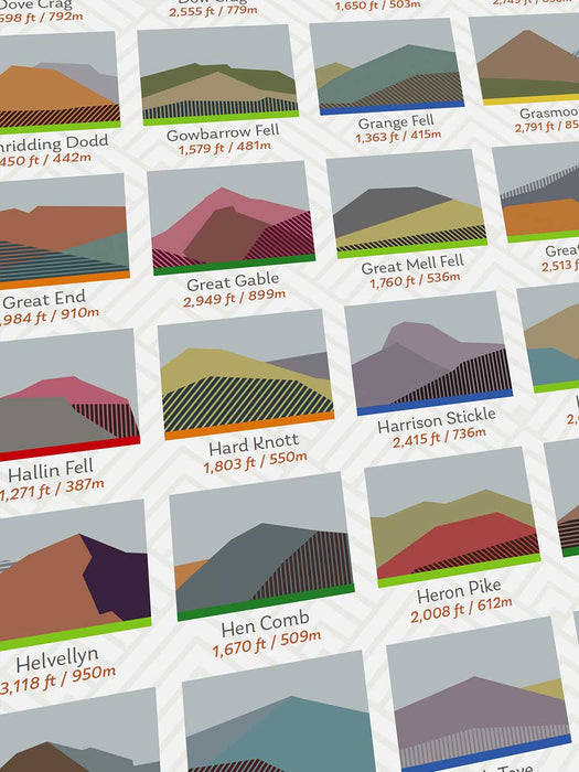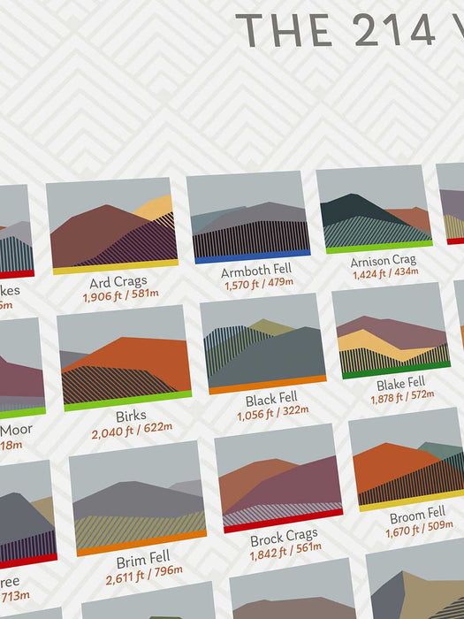 All 214 Wainwrights in The Lake District are detailed on this poster print. Our 214 Wainwrights poster features all the Lake District fells alphabetically in a geometric styled profile, along with the heights. Colour code bars are based on the original Alfred Wainwright walking books representing the 7 volumes and area categorisation. Presented  A perfect gift for fell walkers and those taking on the challenge to complete all the Wainwrights. Height measures in both feet and meters.