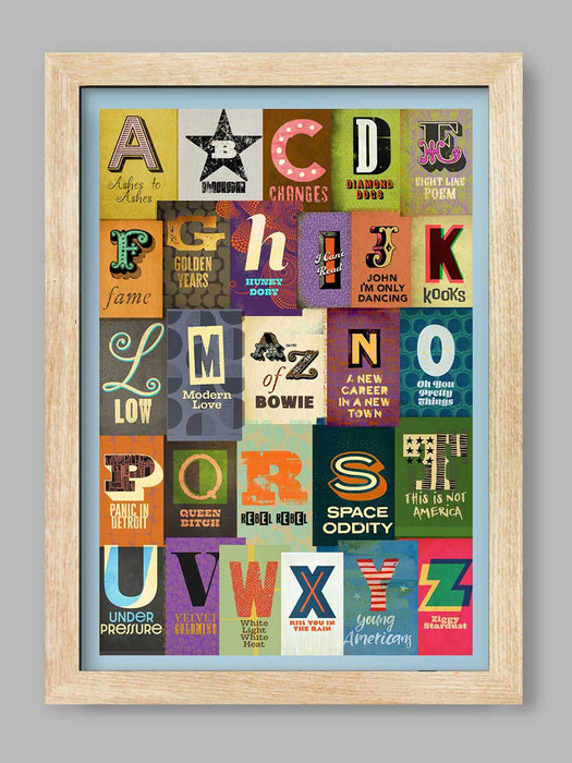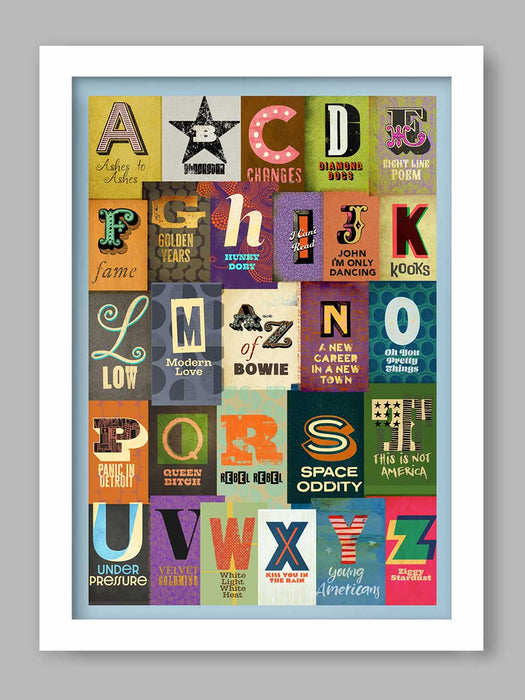 A-Z of Bowie Music Poster Print is printed on a smooth 230g stock and available unframed or framed in a wooden frame with clarity+ acrylic.