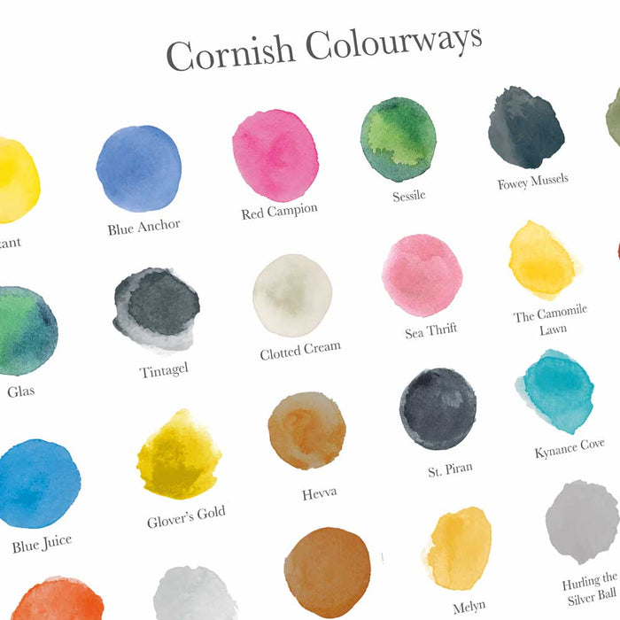 Cornish Colourways - Poster print. Features colours distinct to Cornwall. The blue of Kynance Cove, the green of Heligan, the rich rusty hues of the Pasty and many more.