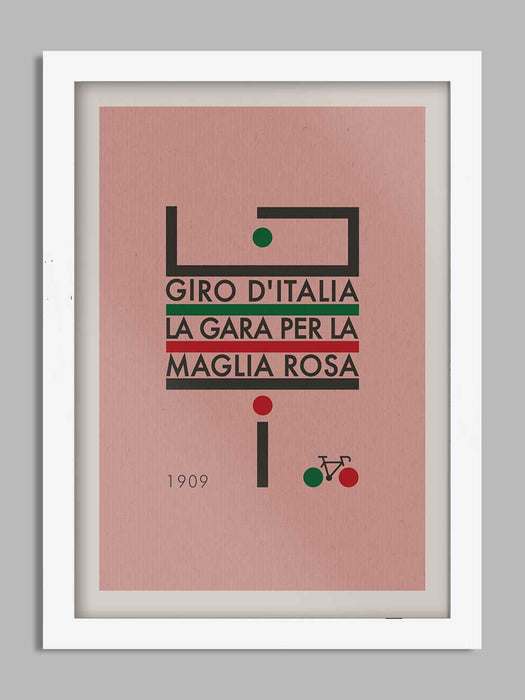 Part of a series of Grand Tour posters inspired by iconic imagery. Our Giro d'Italia Poster Print takes its influence from a poster for an Italian Futurist exposition by designer Fortunato Depero. This design was later used by designer Peter Saville for the band New Order's first album 'Movement'. This design utilises the circles to form the italian flag and the bike. La gara per la maglia rosa - 'the race for the pink jersey'.