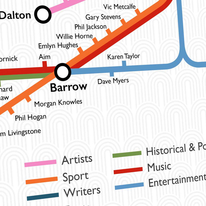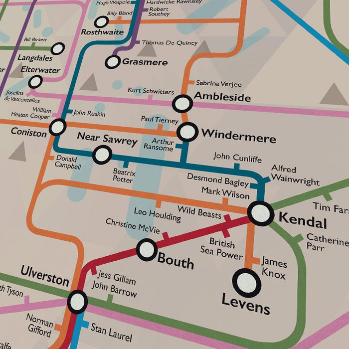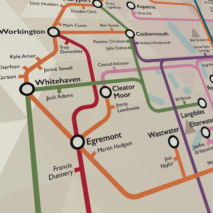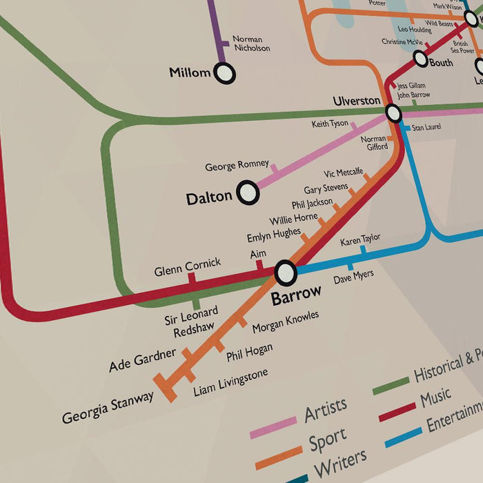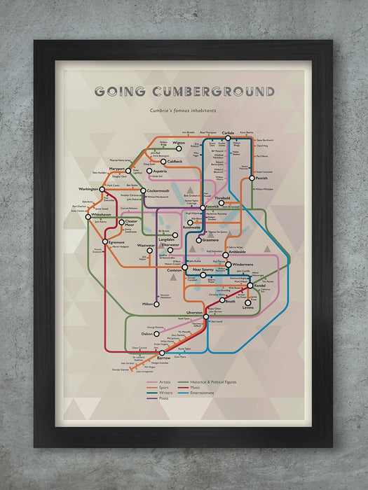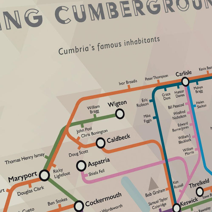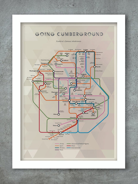 Our map featuring some of Cumbria's most famous inhabitants. This Cumbria poster print will provide a great talking point as you discover who hails from these parts.