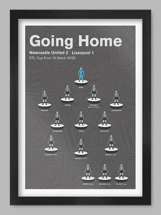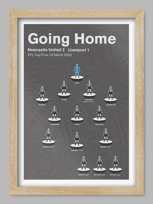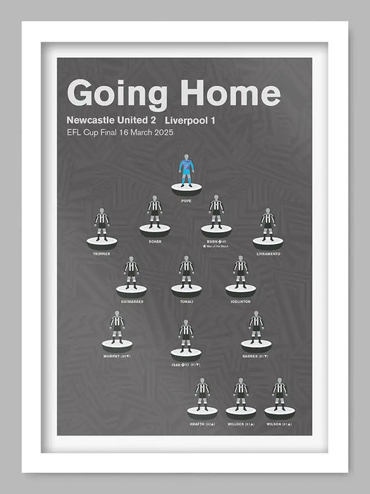Howay The Lads - Newcastle United poster print is our Subbuteo inspired poster of Newcastle United's EFL Cup Final victory. And in case you don't know the name of the tune the Toon walk out to on match days...it's 'Going Home'.