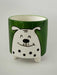 A small handmade ceramic green planter with a dog illustration and raised feet.