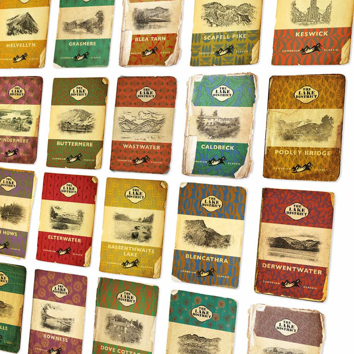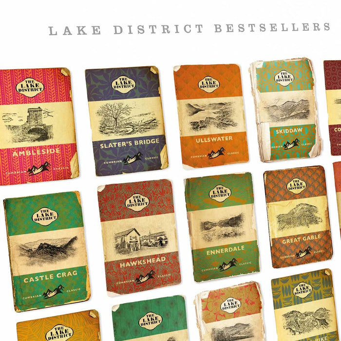 Lake District Bestsellers - Lake District Poster Print features some of the iconic destinations of the Lakes, all styled on the mid-century Penguin Book covers.