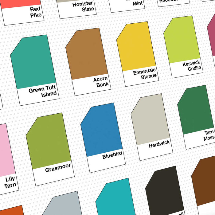 Our Lake District Colourways Swatch Poster Print, is a modern styled design featuring 64 colour palettes which refer to colour influenced landmarks, elements of nature and popular products in Lake District Culture. From fells such as Buttermere through to popular beers, flora, art and Beatrix Potter's Cecily Parsley!
