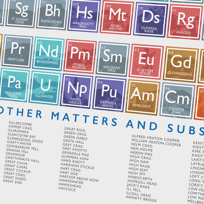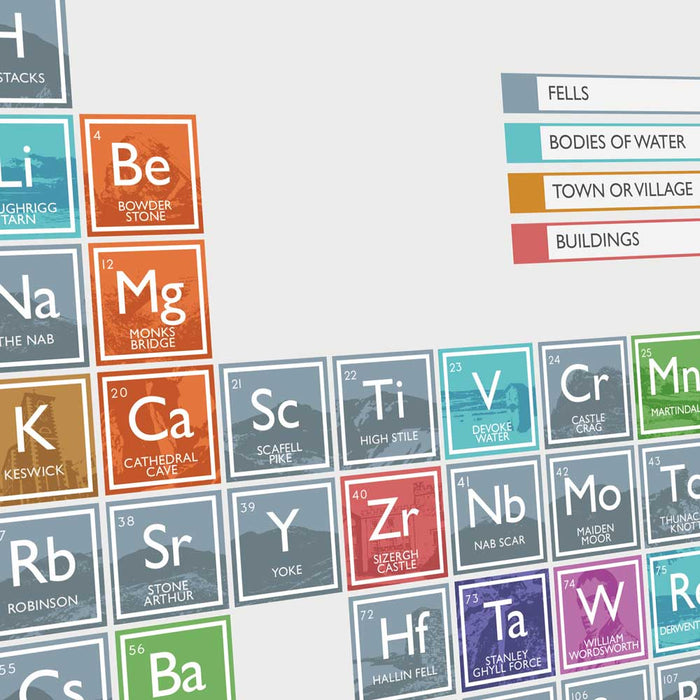 Our Lake District Periodic Table Poster Print is a play on the Periodic Table in which the chemical elements and their symbols have been converted into famous Lake District landmarks. Categories include Fells, Waters, Valleys, People etc. Iconic National Park names such as Scafell Pike, Helvellyn, Borrowdale and a whole host of wonderful listed locations and names within the poster itself.