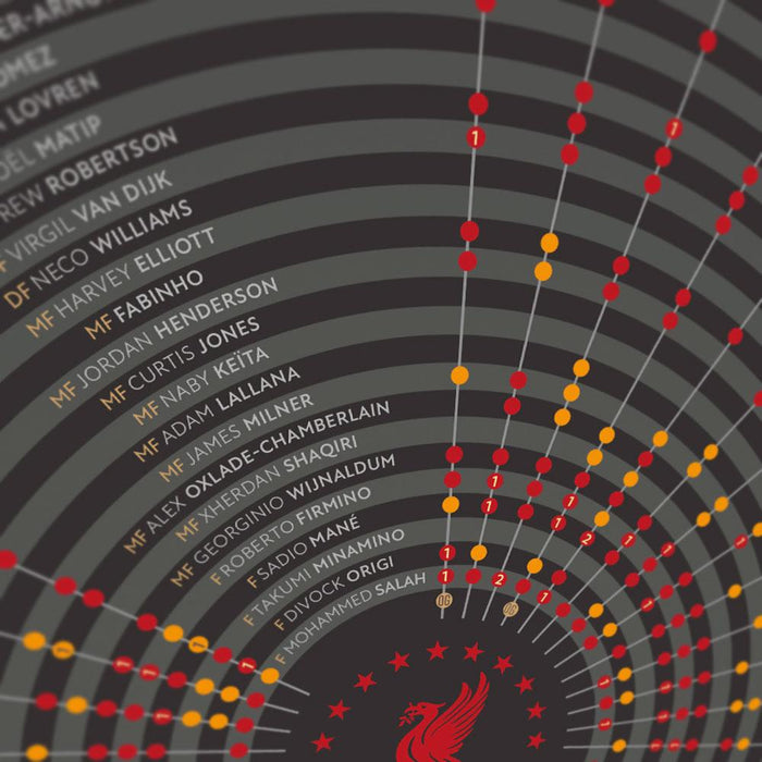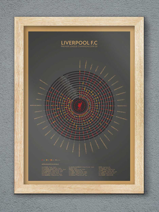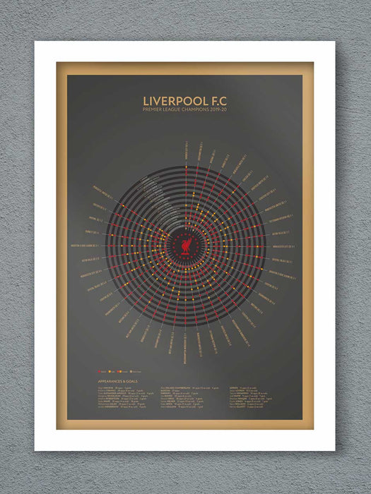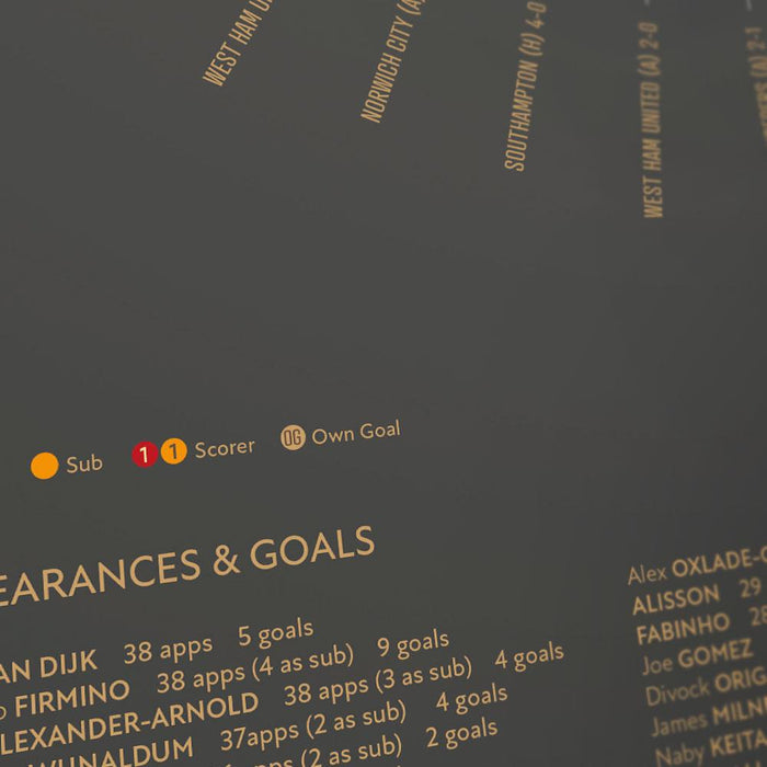 This poster records the 2019-20 season which saw Liverpool claim their 19th League Title. The design covers each match, the line-ups and goalscorers.
