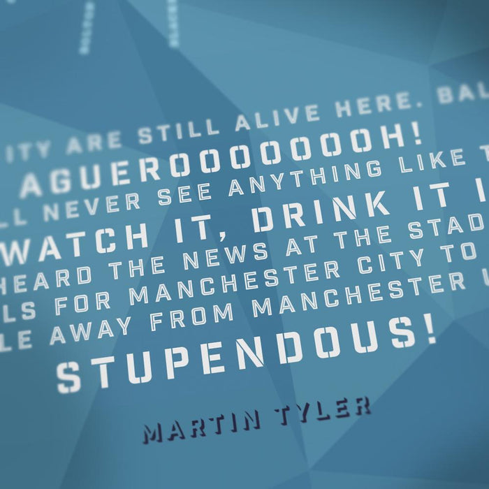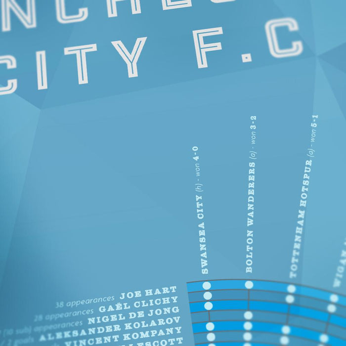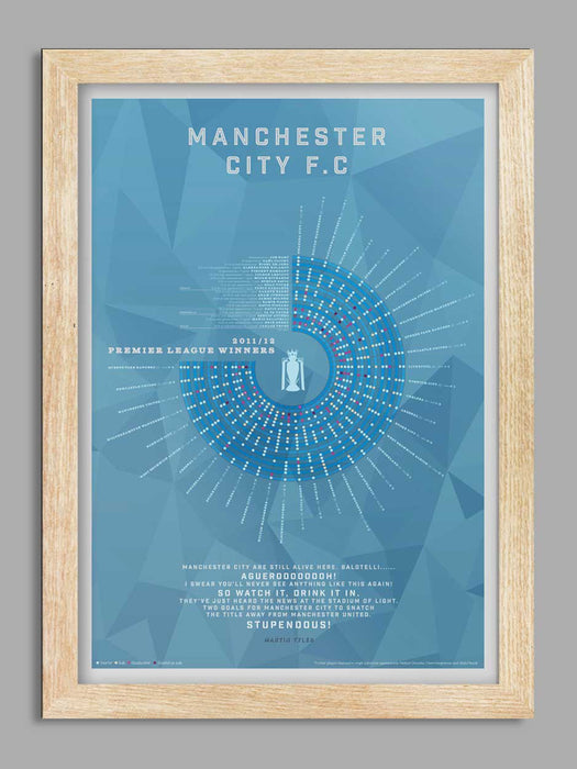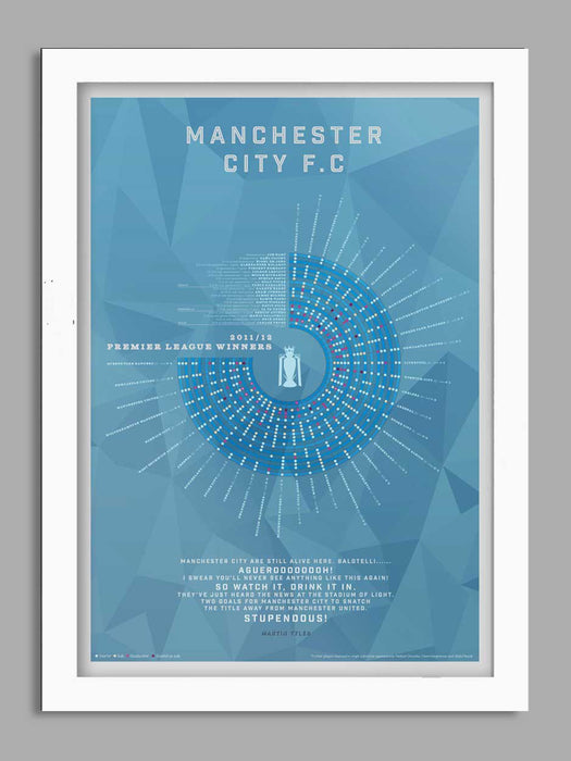 Celebrating City's 2011/12 Premier league title, which culminated in the extraordinary last minute victory that sealed the title and denied their neighbours Manchester United. The image covers each league game, appearances and goals together with Martin Tyler's legendary commentary of the season's conclusion.