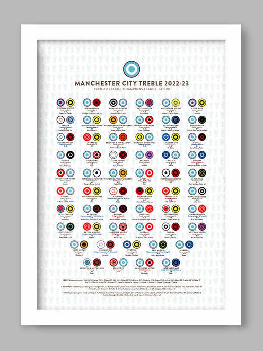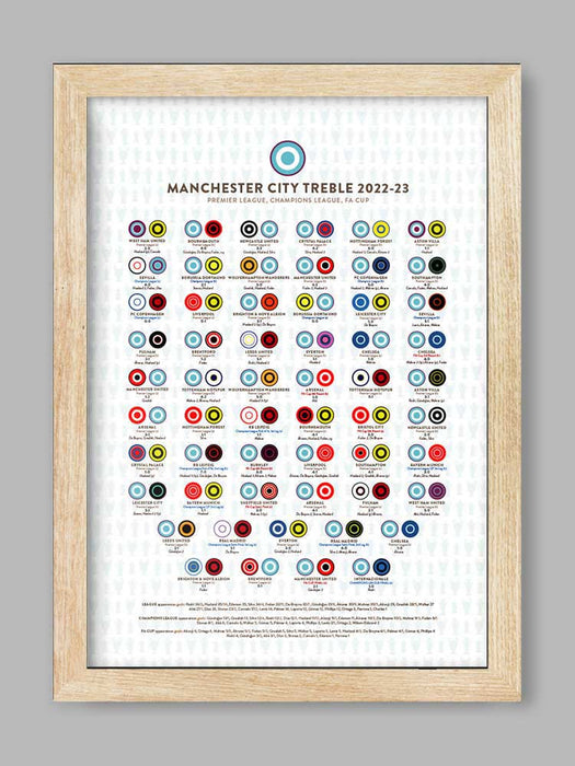 Our Manchester City Treble 2022-23 - Football Poster Print is printed on a smooth 230g stock and available unframed or framed in a wooden frame with clarity+ acrylic.