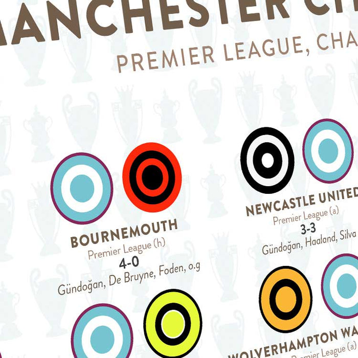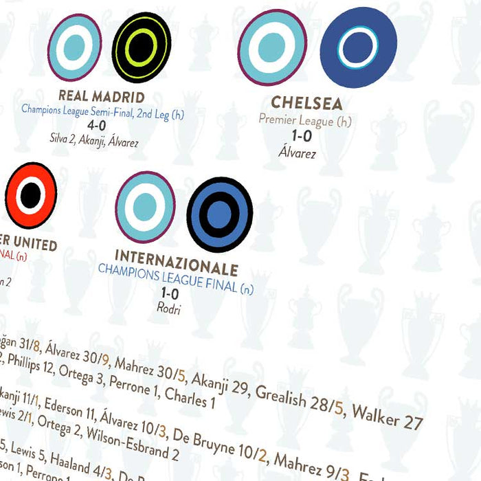 Manchester City Treble 2022-23 - Football Poster Print celebrates the club's achievement of winning the Premier league, Champions League and FA Cup in the 2022-23 season.