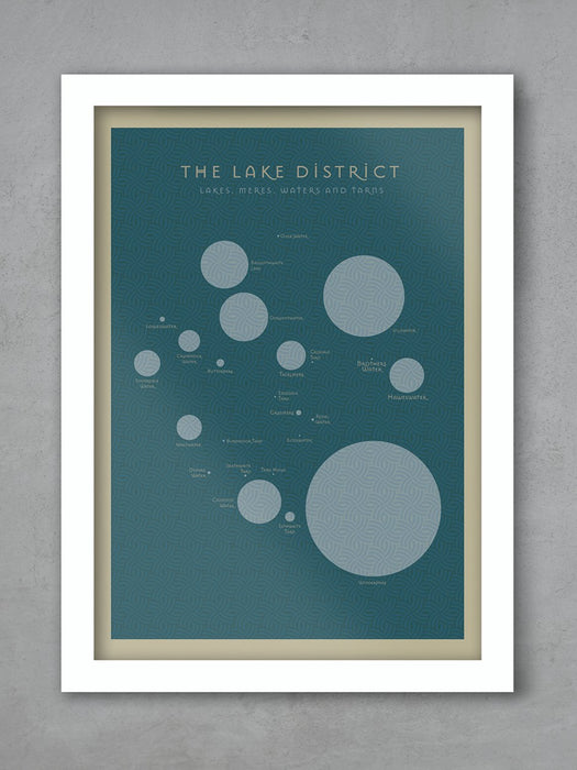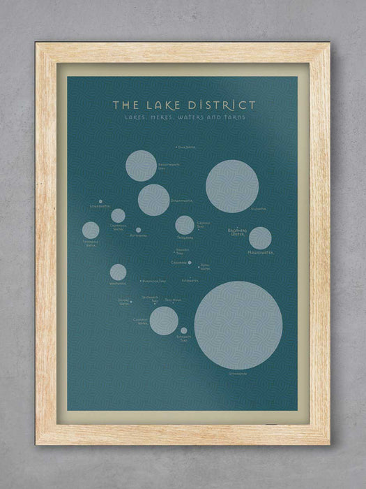 Our Lake District Poster Print is part geographic and part infographic, showing the major lakes, meres and tarns of the Lake District. Each of the dots are in proportionate size to the largest - Windermere.