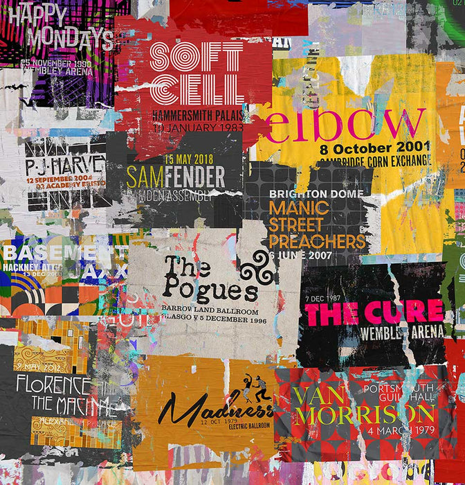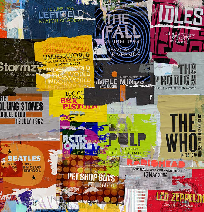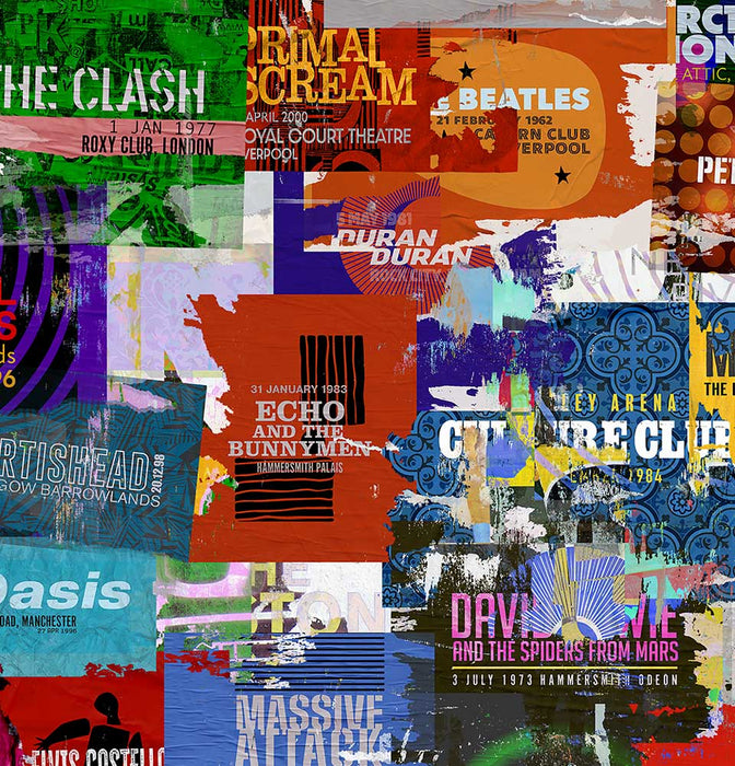 We've re-created a series of band gig posters, torn and worn. The catalogue of bands covers eras and genres from The Beatles up to Wolf Alice. Where you can see and venue and date, it is a faithful reproduction. These gigs did happen!