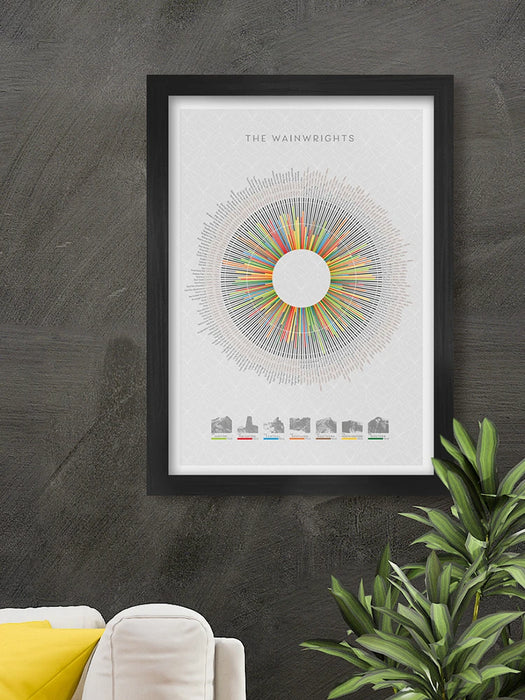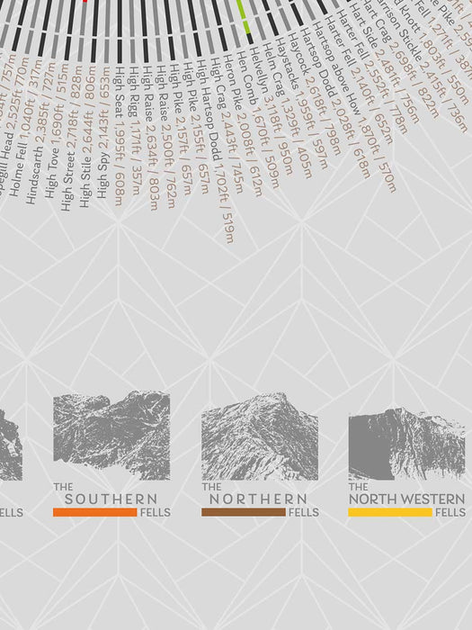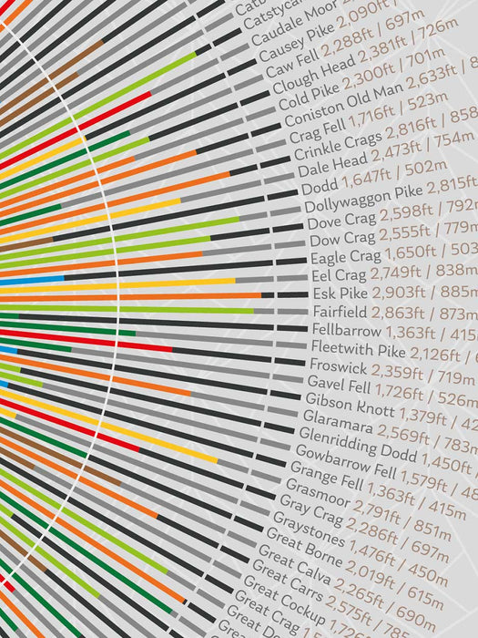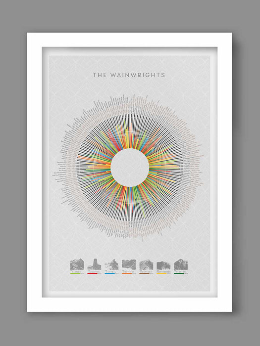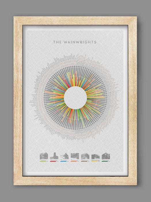 All 214 Wainwrights in The Lake District are detailed on our Wainwrights Wheel poster print. The 214 Wainrights Wheel poster details all the fells along with the heights. Colour coding is based on the original Alfred Wainwright walking books representing the 7 volumes and area categorisation. Each colour bar lengths relates to the fells height. The wheel works on the fells being charted alphabetically. Height measures in both feet and inches. The Wainwrights Wheel poster print is a perfect gift for fell walkers and those taking on the challenge to complete all the Wainwrights.