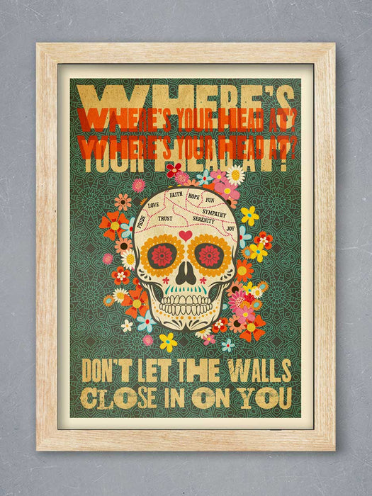 Our Where's Your Head At Music Poster Print features a quote from the Basement Jaxx 2001 single. The design incorporates a phrenology styled skull with positive emotions and credo.